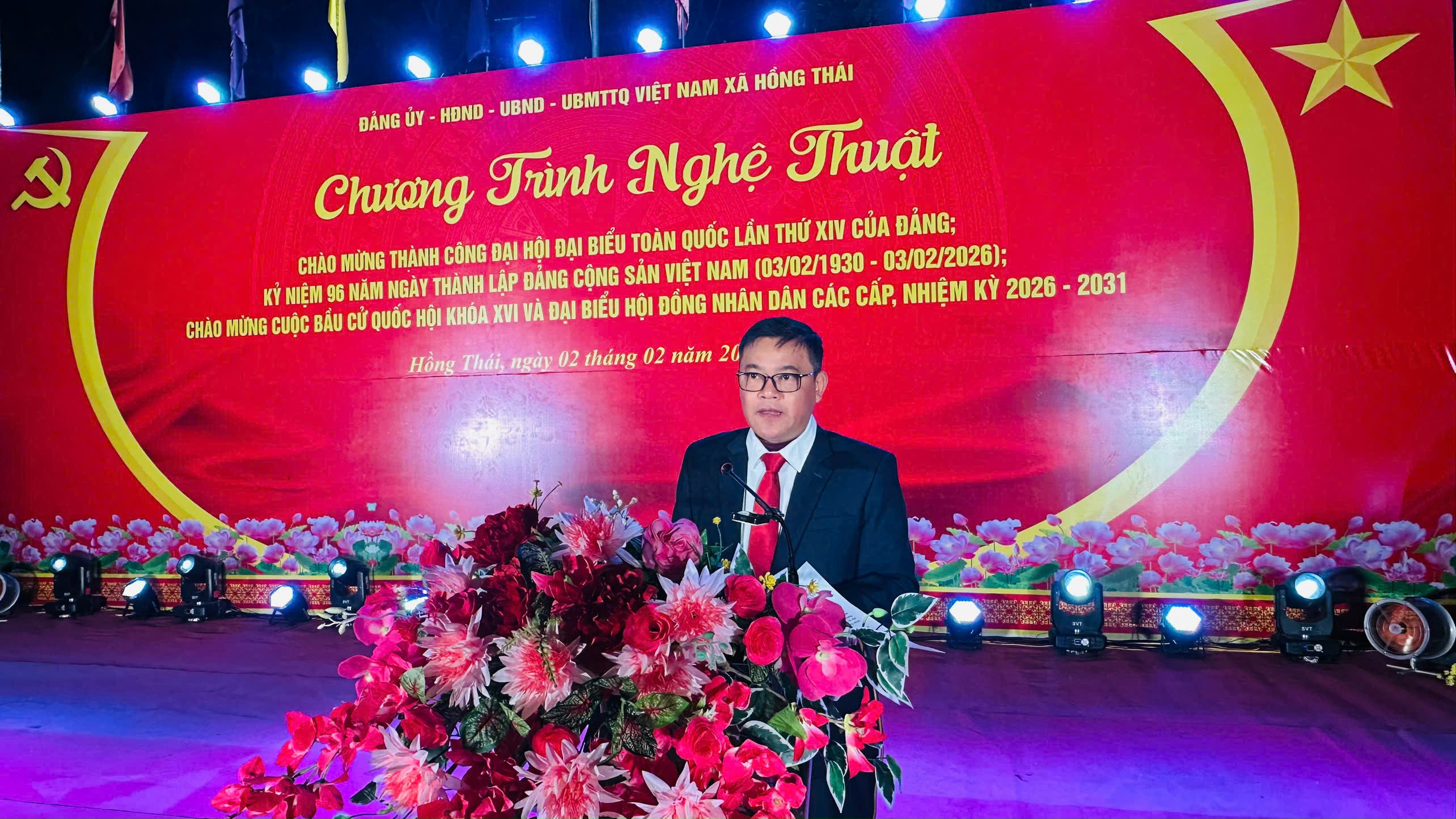Tối 02/02/2026, tại trung tâm thôn Xá Thị xã Hồng Thái, UBND xã Hồng Thái đã tổ chức thành công Chương trình biểu diễn nghệ thuật với chủ đề chào mừng thành công Đại hội đại biểu toàn quốc lần thứ XIV của Đảng; kỷ niệm 96 năm Ngày thành lập Đảng Cộng sản Việt Nam (03/02/1930 – 03/02/2026); đồng thời hướng tới cuộc bầu cử đại biểu Quốc hội khóa XVI và bầu cử Hội đồng nhân dân các cấp nhiệm kỳ 2026–2031.